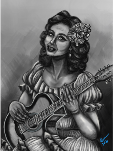 “She’s seated in a round-backed wicker chair and gently strumming a Spanish guitar. Her hair cascades to her shoulders in graceful waves.”